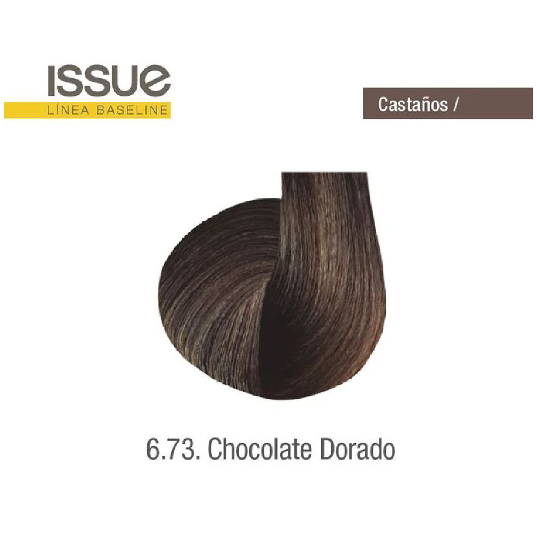Issue Tintura 6.73 Chocolate Dorado es una opción elegante y cálida dentro de la gama de colores para cabello. Este tono combina un chocolate profundo con matices dorados, creando un resultado que es sofisticado y naturalmente luminoso.